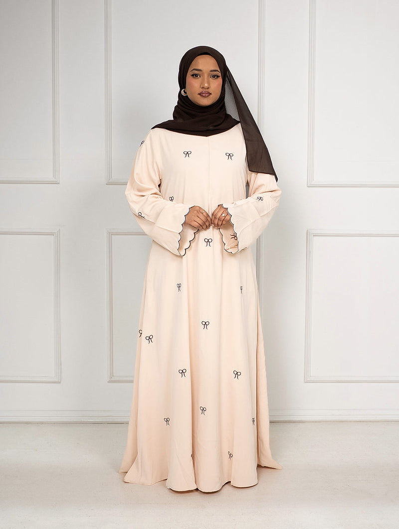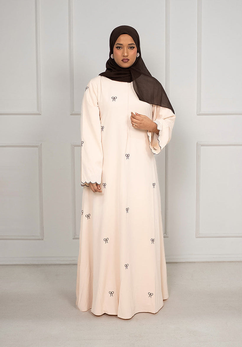 Safa Embroidered Bow Closed Abaya With Zip - Cream