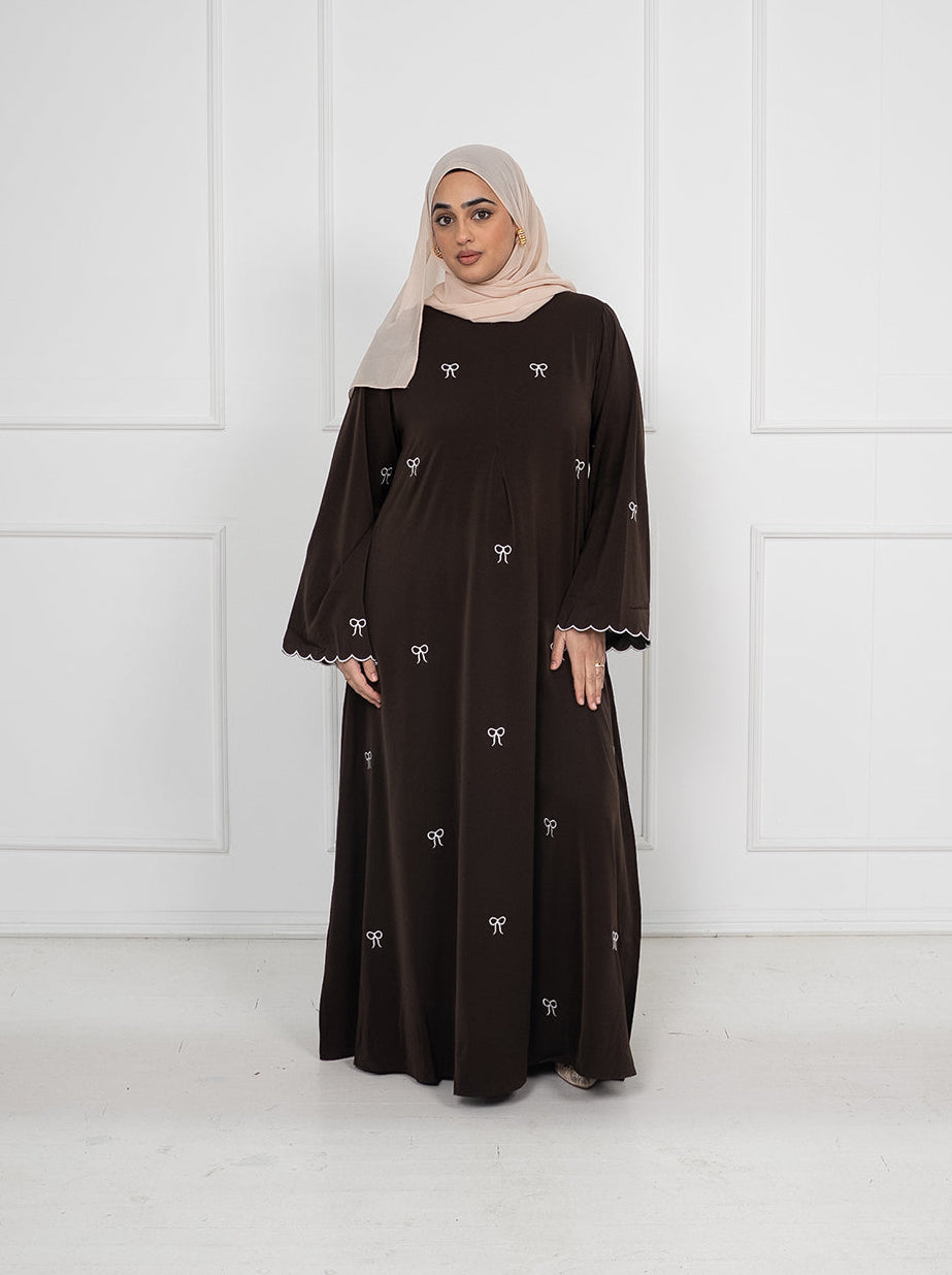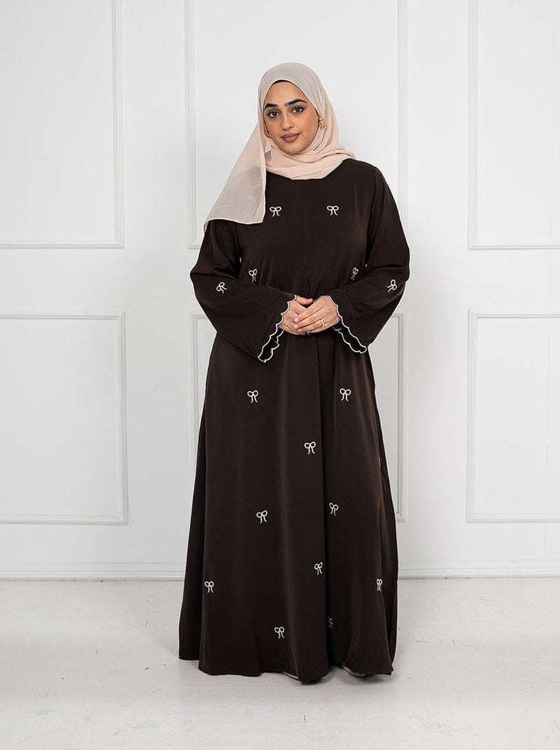 Safa Embroidered Bow Closed Abaya With Zip - Brown
